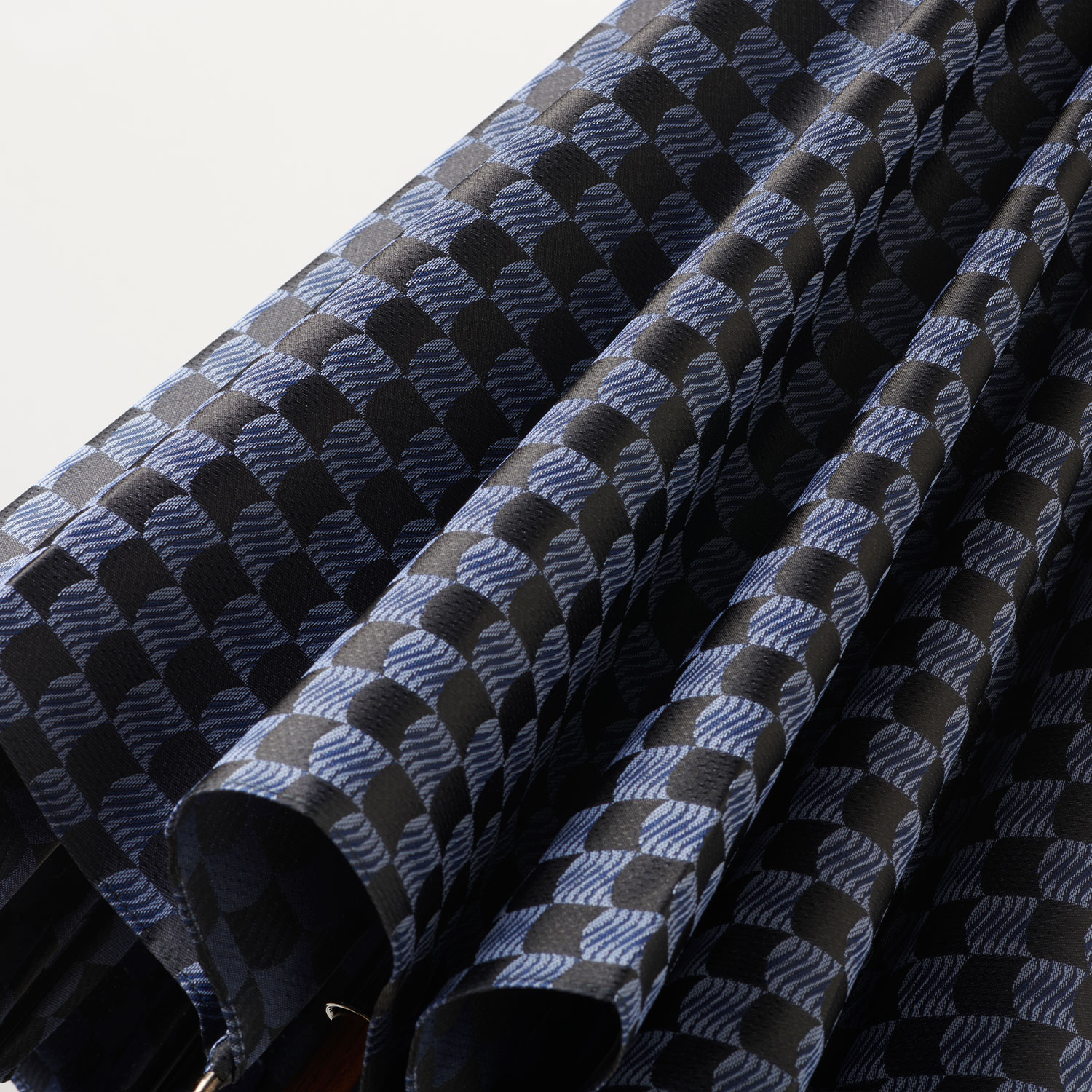 傘全体を覆うのは、ウロコの総柄。細かい柄も得意とするジャガード織※で丁寧に織り込みました。精緻な織り目が傘表面の光沢感を生み出しており、織の技術の高さを物語ります。