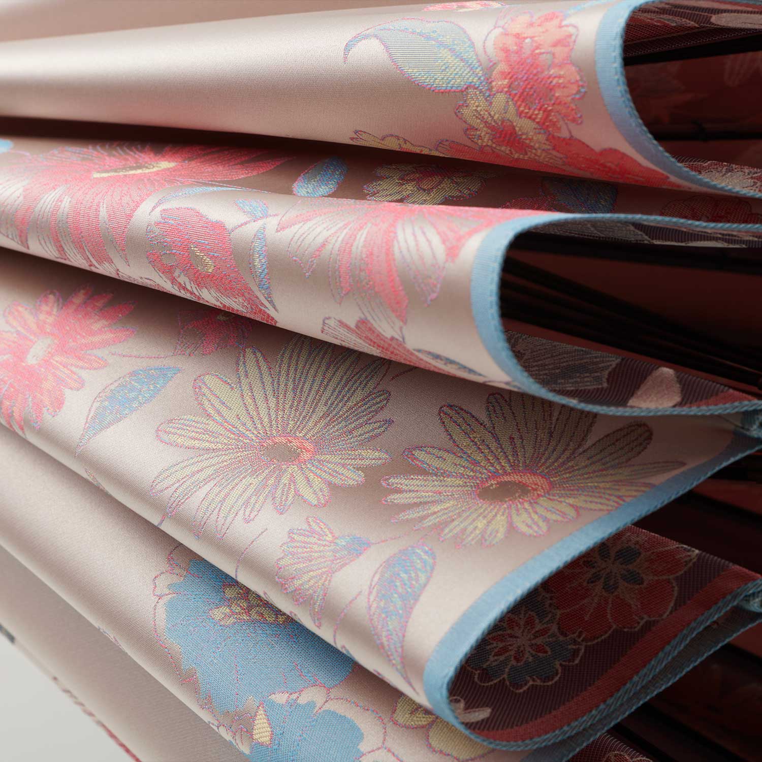 傘全体を一枚のキャンバスのように描かれた、動きのある花の構成はコマ取り※ならでは。