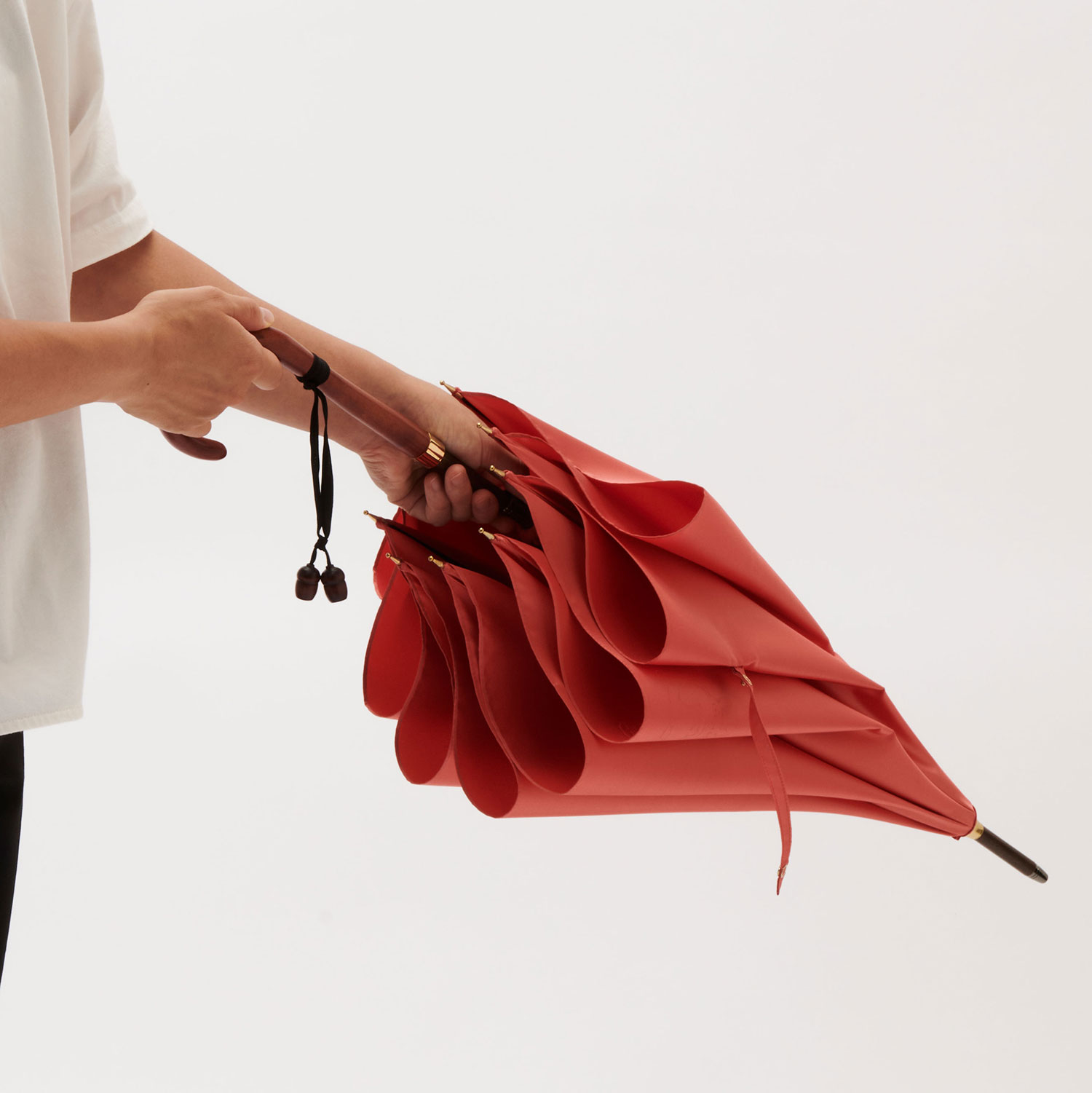 微妙なカーブを計算して裁断した三角形の生地を深張りに仕立てることで、雨をよりしのぎやすい安心感のある傘に。