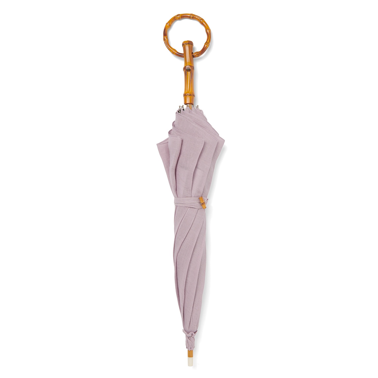 ポイントは麻生地と相性抜群の竹製の輪っか手元。ネーム紐のボタンも竹製で統一しました。