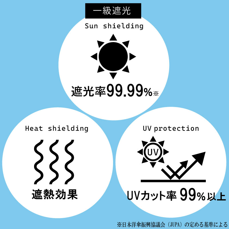 ※弊社が所属する日本洋傘振興協議会(JUPA)では、遮光率が99.99%以上の生地を使用した傘を「一級遮光傘」と定めております。