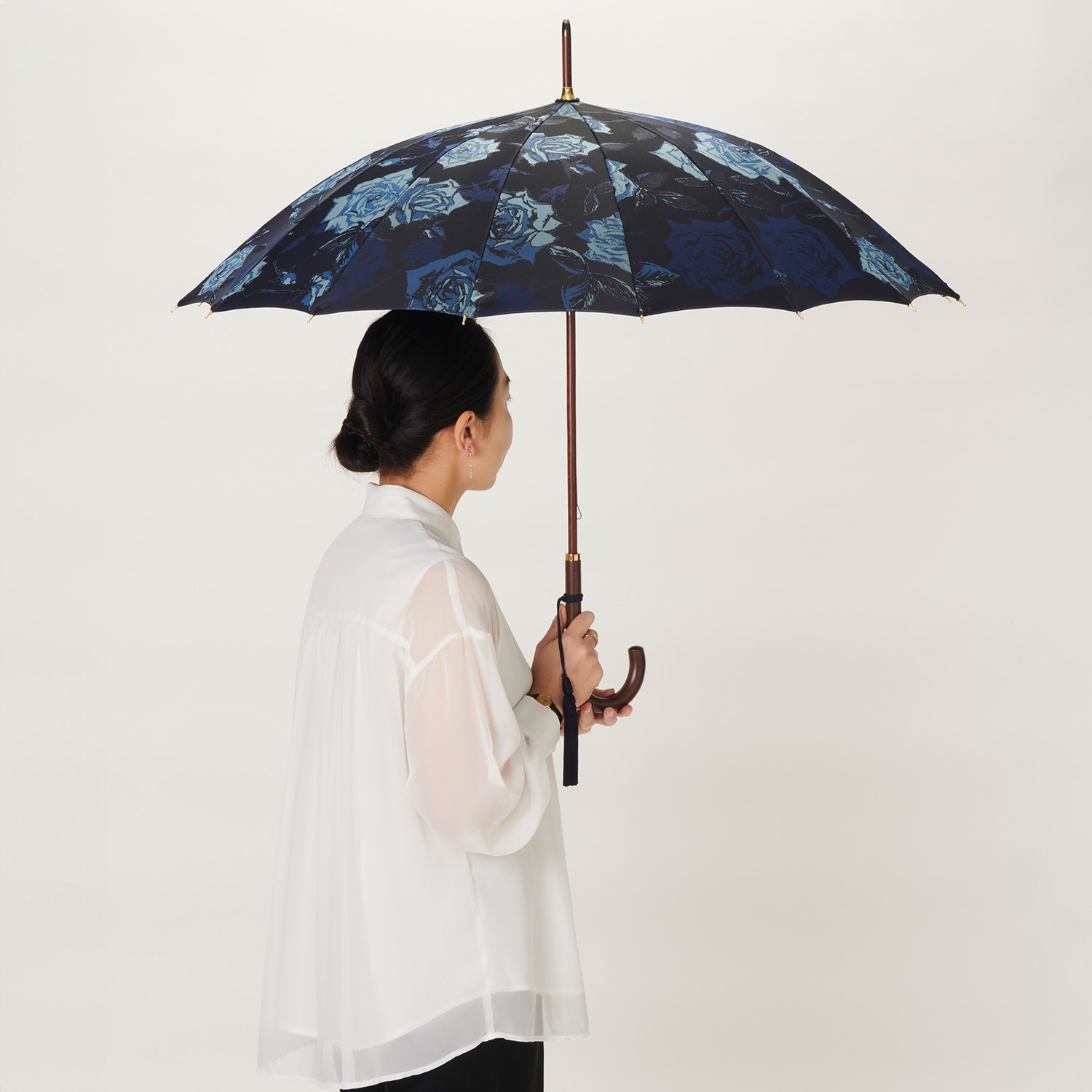 雨の日も香りだつような薔薇に包まれる大人のレインアイテムです。